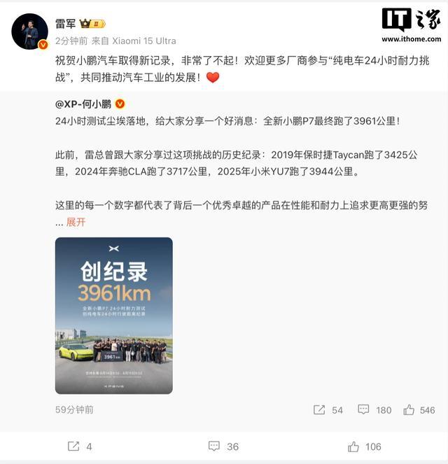 雷軍祝賀小鵬P7 24小時(shí)跑3961公里并邀廠商參與挑戰(zhàn)