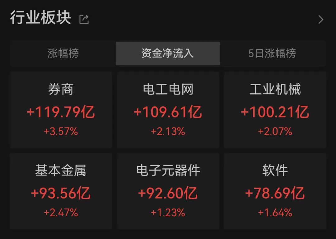 場內(nèi)超4400股飄紅,券商板塊強(qiáng)勢拉升大漲3.57%。Wind顯示該板塊半日實(shí)現(xiàn)資金凈流入近120億元,長城證券斬獲3連板,天風(fēng)證券亦漲停,中銀證券、東方財富漲近7%。