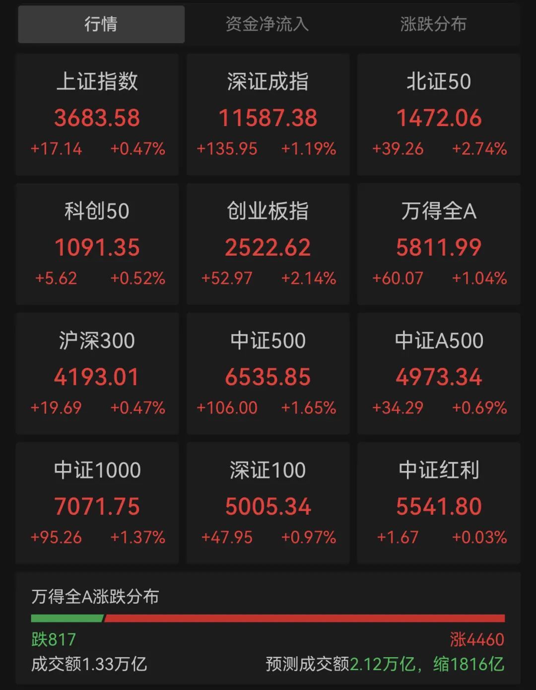 市場整體活躍,兩市主要股指全線走高。截至中午收盤,上證指數(shù)上漲0.47%,深證成指上漲1.19%,創(chuàng)業(yè)板指上漲2.14%,北證50指數(shù)上漲2.74%。