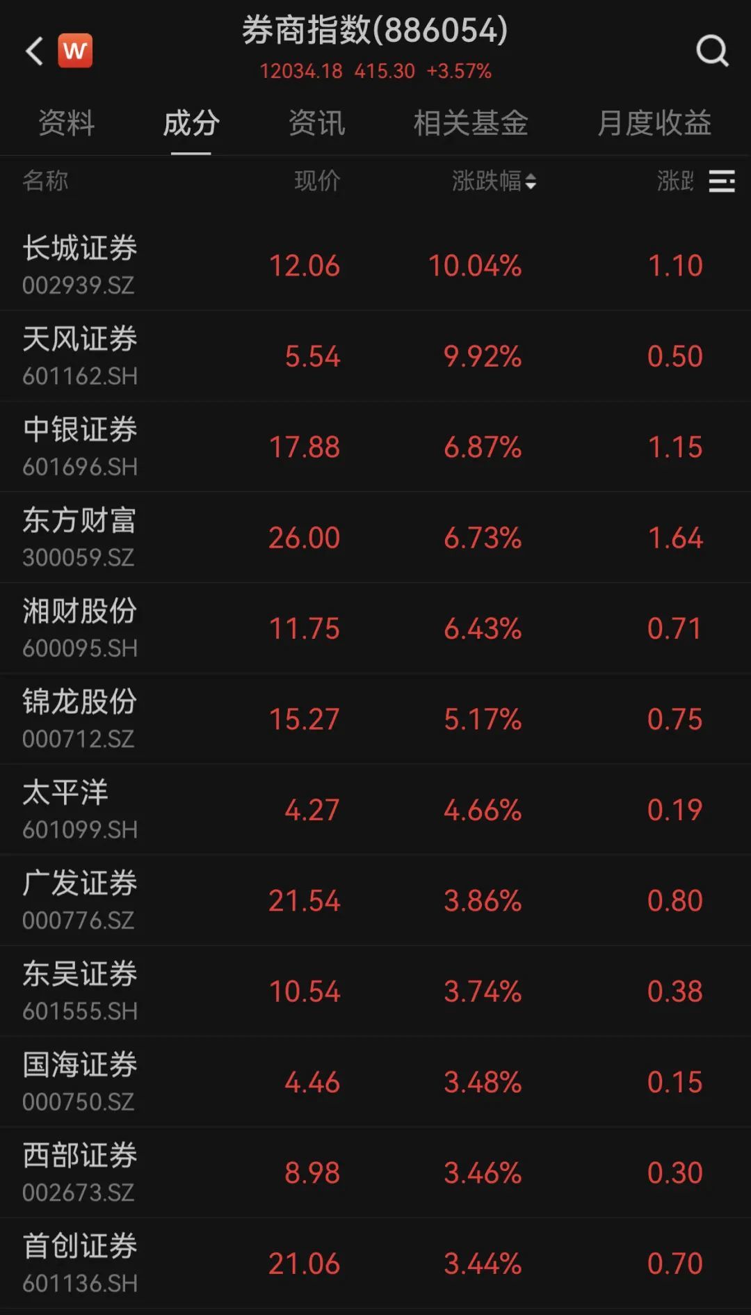 券商板塊強(qiáng)勢拉升,截至中午收盤,長城證券漲停斬獲3連板,天風(fēng)證券亦漲停,中銀證券、東方財富漲近7%。