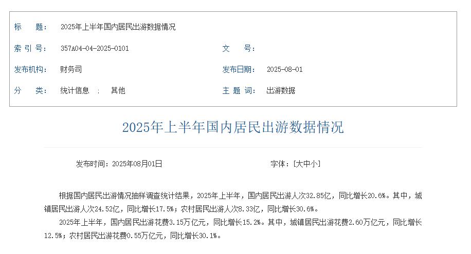 我本以為這只是個暖心的鄉(xiāng)村出游故事,翻數(shù)據(jù)后發(fā)現(xiàn)并非偶然。今年8月國內(nèi)居民出游情況抽樣調(diào)查統(tǒng)計(jì)結(jié)果顯示,2025年上半年,全國農(nóng)村居民出游人次達(dá)到8.33億,同比增長30.6%,而城鎮(zhèn)居民出游人次是24.52億,同比增長17.5%,農(nóng)村出游增速幾乎是城市的兩倍。