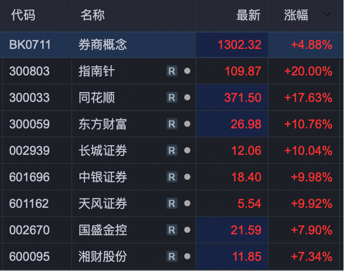 券商股持續(xù)表現(xiàn)強勢。截至發(fā)稿時,指南針、同花順、東方財富、長城證券、中銀證券、天風證券等個股漲?;蛘邼q幅超過10%。