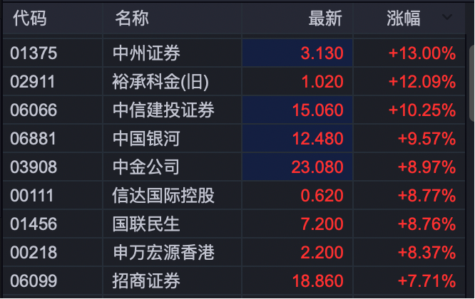 港股券商股也全面上漲,截至發(fā)稿,中州證券、中信建投證券、中國銀河、中金公司、申萬宏源香港、招商證券等個股漲幅超過7%。