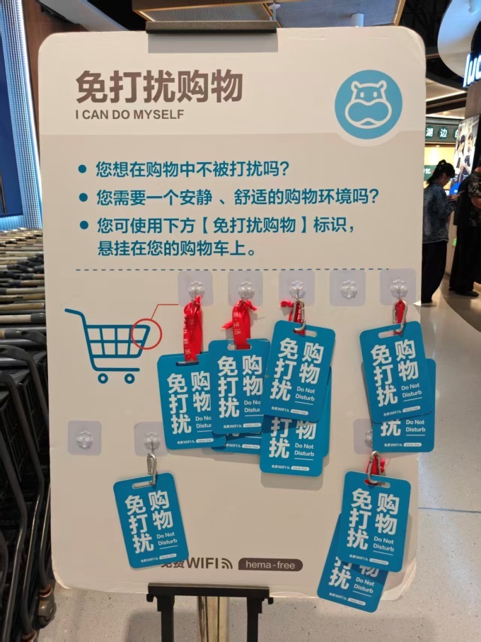 近日,有網(wǎng)友在深圳盒馬購物時發(fā)現(xiàn),門店上線了“免打擾購物”卡,只需將“免打擾購物”標識掛在購物車上,購物過程中就不會被打擾。