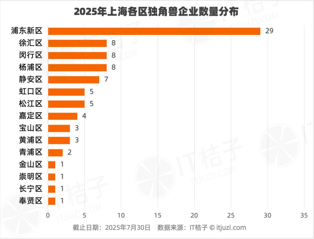 上海當前在榜的獨角獸企業(yè)主要分布在哪些區(qū)域呢?上海下轄16個行政區(qū),獨角獸企業(yè)分布呈現顯著的區(qū)域不均衡特征。根據IT桔子數據,截至2025年7月30日,上海獨角獸企業(yè)的區(qū)域分布如下: