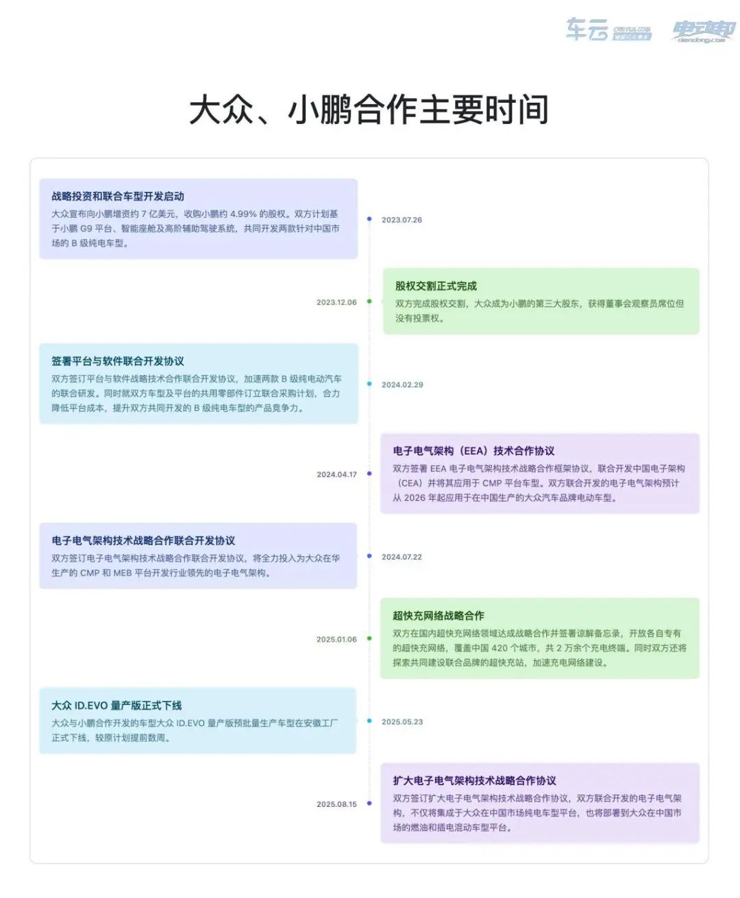 實際上,回顧大眾與小鵬的合作歷程,這已是兩家企業(yè)在兩年多時間里第八次傳出合作相關消息。從戰(zhàn)略投資入股到量產(chǎn)車下線,再到接連簽訂多重合作協(xié)議,兩家車企的合作已進入全面深化階段。車云整理了自2023年以來雙方合作的大事年表,其進展速度之快、范圍之廣、維度之多、關聯(lián)之深,都十分罕見。