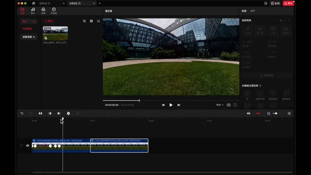 軟件方面,手機端可使用DJI Mimo,電腦端可使用DJI Studio或在PR上安裝全景插件。電腦端官方軟件處理全景視頻功能較全面,但處理單鏡頭視頻功能單一,甚至不支持多軌道編輯。目前來看,更推薦使用DJI Mimo,操作更流暢便捷。