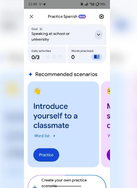 近日,Telegram用戶Mehrad發(fā)現(xiàn)谷歌翻譯可能會新增“練習(xí)”按鈕,方便用戶練習(xí)新語言。Mehrad還曬出了“練習(xí)西班牙語”的界面截圖,其中展示了用戶目標(biāo)、日?;顒雍鸵丫毩?xí)詞匯等內(nèi)容。