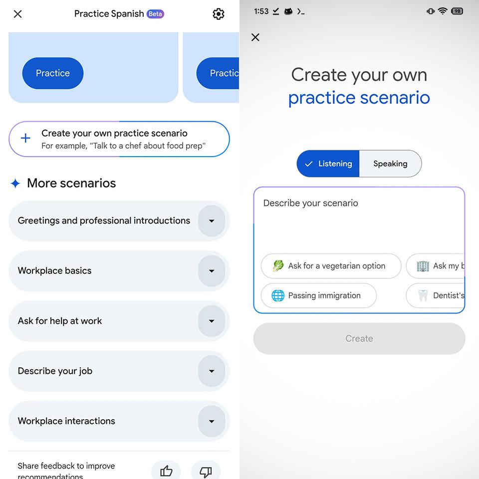 該功能會提供基于現(xiàn)實生活的“推薦”場景供用戶練習(xí),如介紹、問候、問路等,這些場景還會進(jìn)一步細(xì)分。若預(yù)設(shè)場景不合適,用戶可以自定義場景,谷歌翻譯也會提供一些建議。用戶還能選擇場景是聽力練習(xí)還是口語練習(xí)。