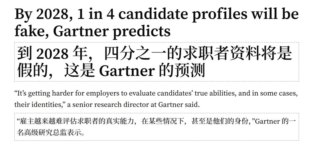 Gartner預(yù)測,到2028年,每四份候選人資料里,就會有一份是假的。