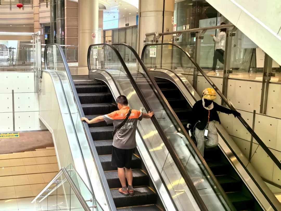 一到中午,商場仿佛被重啟,戴著藍(lán)、黃或紅色頭盔的騎手在空蕩蕩的商場里上下奔走,每人手里拎著一兩份外賣,跑得汗流浹背,跑累了就席地而坐,就像在看現(xiàn)實(shí)版的“生存游戲”。