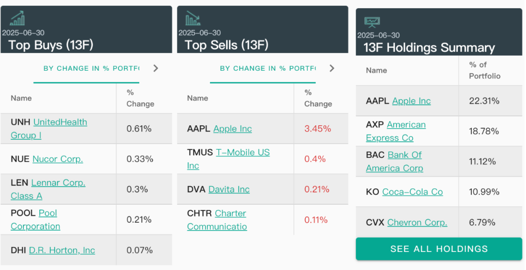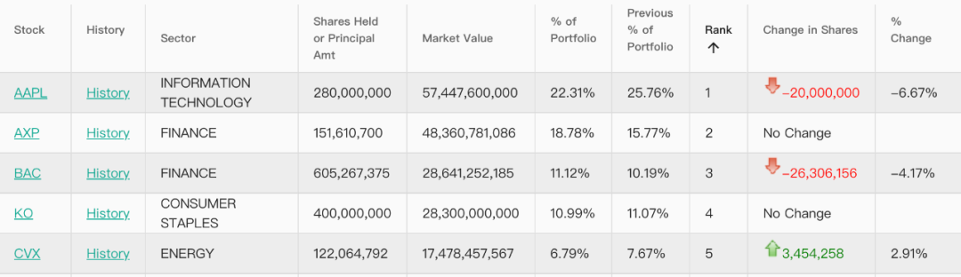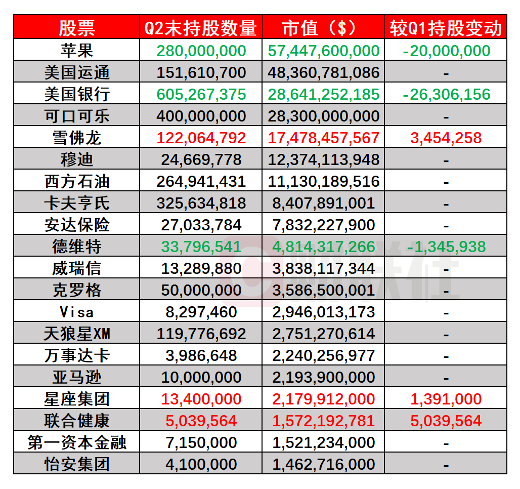 最后再來(lái)說(shuō)說(shuō)股神最新的整體持倉(cāng)情況。除了上面提到新建倉(cāng)的6只股票,巴菲特在二季度還分別減持了2000萬(wàn)股蘋果和2630萬(wàn)股美國(guó)銀行,并清倉(cāng)了美國(guó)跨國(guó)移動(dòng)電話運(yùn)營(yíng)商T-Mobile??吹贸鰜?lái),股神也在換倉(cāng)。而截至二季度末,伯克希爾的前五大持倉(cāng)依然是蘋果、美國(guó)運(yùn)通、美國(guó)銀行、可口可樂(lè)以及雪佛龍。
