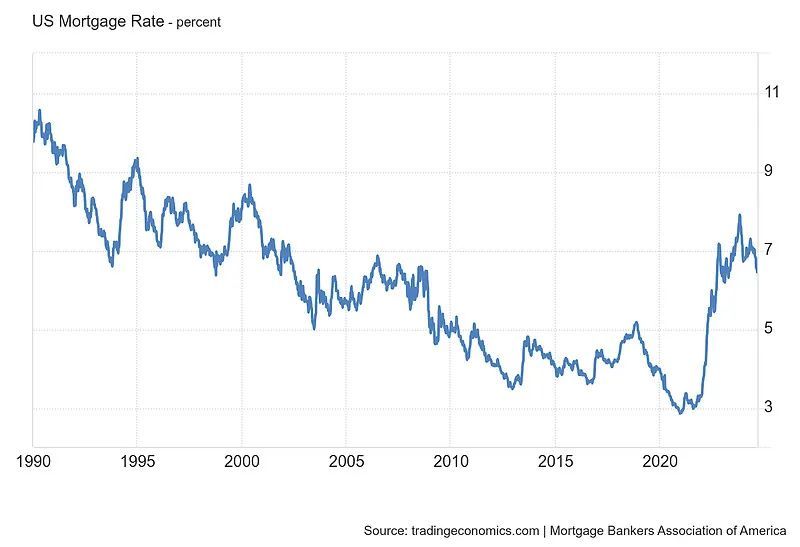 最近一年,美國(guó)30年抵押貸款利率基本都在6.5% - 7%之間,比我們高一倍。