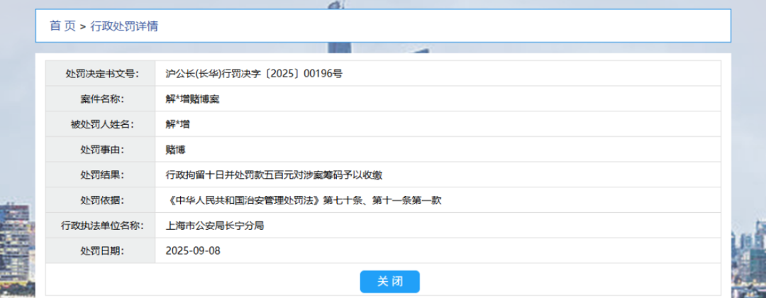 近日,上海市公安局長寧分局官方網(wǎng)站公布了“解*增賭博案”的行政處罰信息。