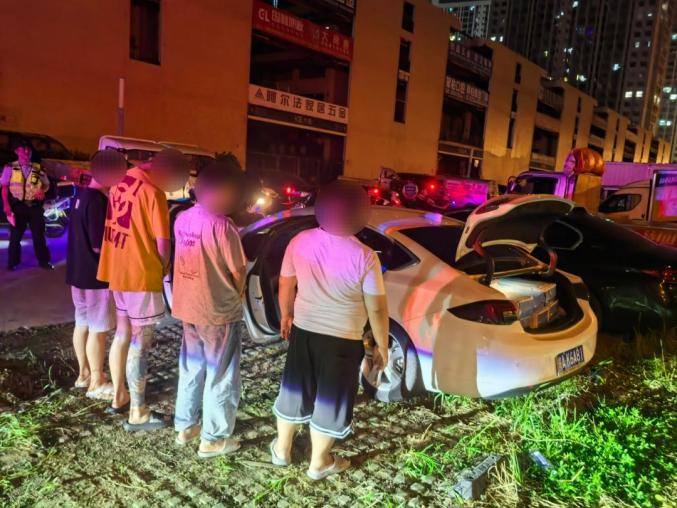 22時(shí)許,巡邏人員發(fā)現(xiàn)一名男子神情恍惚、步履蹣跚,形跡十分可疑。巡邏隊(duì)伍立即分為兩組展開行動(dòng),一組對(duì)該男子進(jìn)行盤查,另一組繼續(xù)巡視,很快就在停車場(chǎng)內(nèi)發(fā)現(xiàn)一輛白色小轎車,兩人看守,另有一人在向他們咨詢。