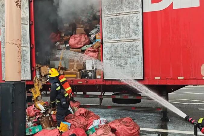 消防救援人員趕到后,立即用水槍壓制火勢(shì)。經(jīng)過一個(gè)多小時(shí)的緊張撲救,成功撲滅明火,但車上近半貨物被燒毀。