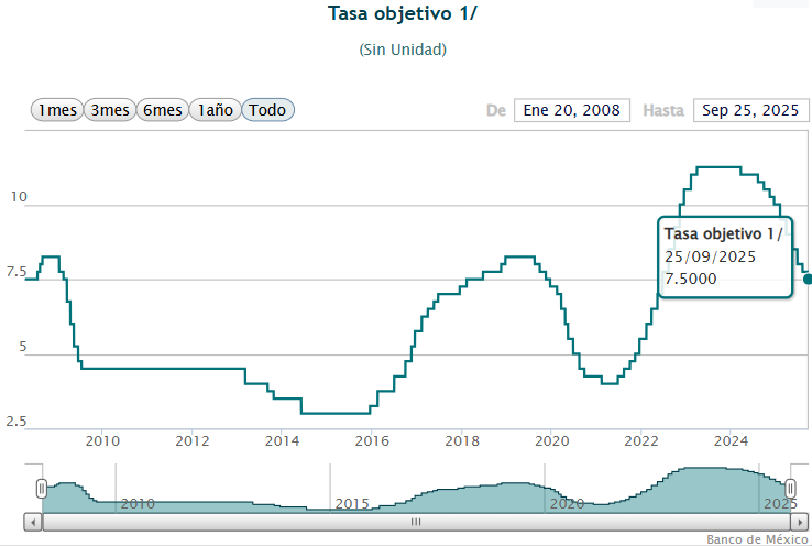 當?shù)貢r間9月25日,墨西哥央行將基準利率下調(diào)25個基點至7.50%。這是該央行自2024年初啟動寬松周期以來的第十一次降息,該寬松周期旨在應(yīng)對當時疲軟的經(jīng)濟形勢。