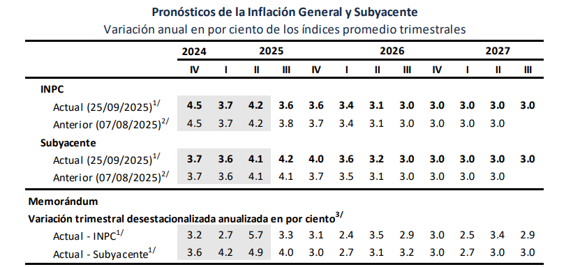 墨西哥央行報告顯示,7月至9月上半月,總體通脹率從3.51%升至3.74%,核心通脹率從4.23%微升至4.26%;對2025年底總體通脹率的預(yù)期有所下降,長期通脹預(yù)期仍相對穩(wěn)定,但高于目標水平。