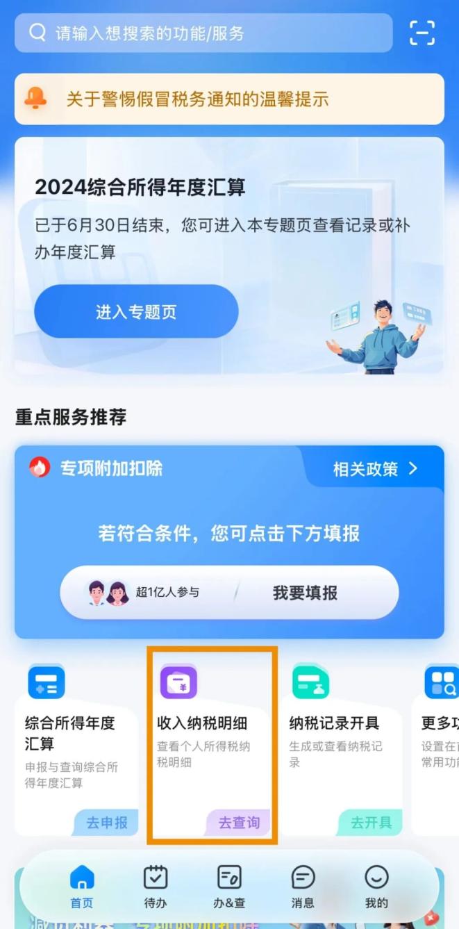 登錄個(gè)人所得稅App→【首頁】→【收入納稅明細(xì)查詢】選擇納稅年度、所得類型。