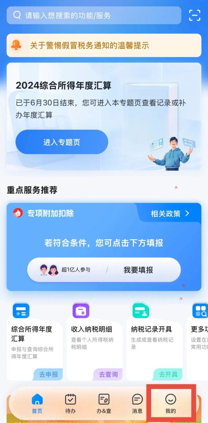 實(shí)名注冊登錄個(gè)人所得稅App——點(diǎn)擊右下角【我的】