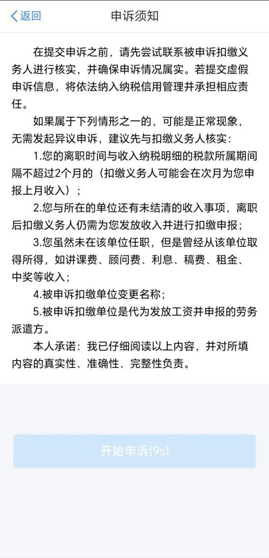 如存在虛假納稅明細(xì)收入,點(diǎn)擊該筆收入,在收入納稅明細(xì)詳情右側(cè)點(diǎn)擊【申訴】提起申訴,認(rèn)真閱讀【申訴須知】后,不屬于下圖中五項(xiàng)情形中任何一項(xiàng)的,點(diǎn)擊【開始申訴】進(jìn)入詳情頁面,申訴類型可選擇【從未在職/曾經(jīng)在職/目前在職】。