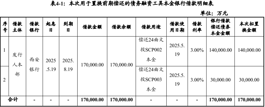 該筆24億元中票募資的聯(lián)席主承銷商是西安銀行,發(fā)行中票的資金于5月中旬向西安銀行借款,期限3個月,用于置換合計17億元的“24曲文投SCP002、24曲文投SCP003”債務(wù),還款賬戶為西安銀行賬戶。
