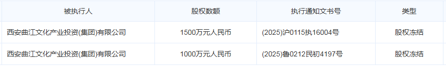 西安曲江文化產(chǎn)業(yè)風(fēng)投公司的母公司西安曲江文化產(chǎn)業(yè)投資集團(tuán)(簡稱西安曲江文投集團(tuán)),持有的合計2500萬元股份在今年7月被集中凍結(jié)。