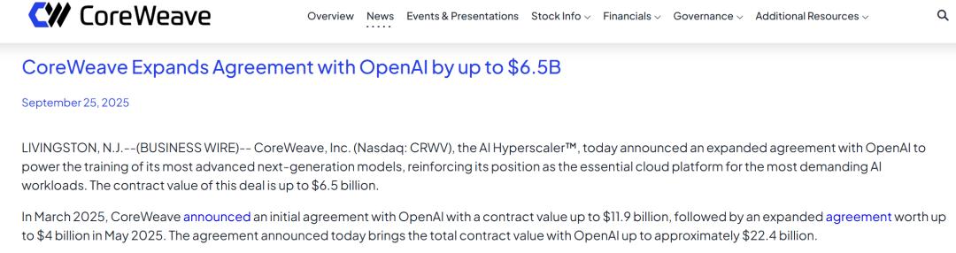 CoreWeave和OpenAI年內(nèi)第三次擴大合作協(xié)議,最新合同金額最高可達65億美元,這讓雙方累計合同規(guī)模達到了224億美元。