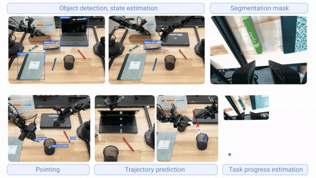 下面展示了Gemini Robotics - ER 1.5的部分能力,包括物體檢測(cè)與狀態(tài)估計(jì)、分割掩碼、指向識(shí)別、軌跡預(yù)測(cè)以及任務(wù)進(jìn)度評(píng)估與成功檢測(cè)。