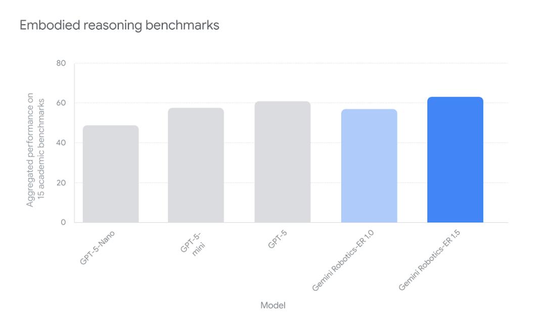 Gemini Robotics - ER 1.5是首個(gè)為具身推理優(yōu)化的思維模型,在學(xué)術(shù)和內(nèi)部基準(zhǔn)測(cè)試中均實(shí)現(xiàn)了最先進(jìn)的性能表現(xiàn)。