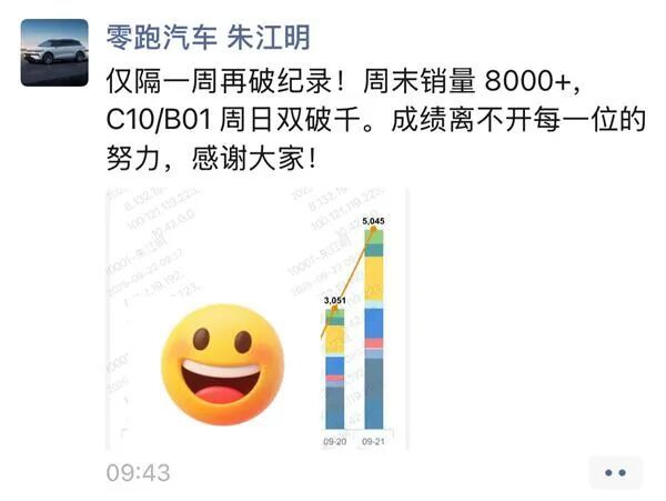9月22日,朱江明在朋友圈發(fā)文稱,僅隔一周再破紀(jì)錄,周末銷量8000 +,C10/B01周日雙破千。