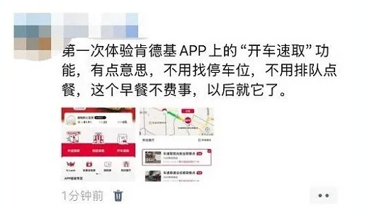 而成都白領(lǐng)小張在體驗肯德基APP“開車速取”功能后,特意在朋友圈分享感受:“不用找停車位,不用排隊點餐,這個早餐不費事,以后就它了?!?/p>