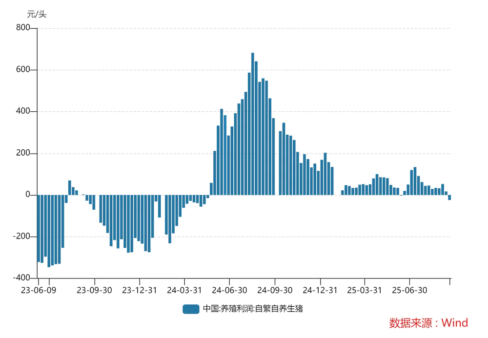 如前文所述,自2024年5月以來(lái),我國(guó)生豬自繁自養(yǎng)模式一直盈利,直到最近開(kāi)始虧損。截至2025年9月19日當(dāng)周,該模式首次出現(xiàn)虧損,每頭虧損24.44元。