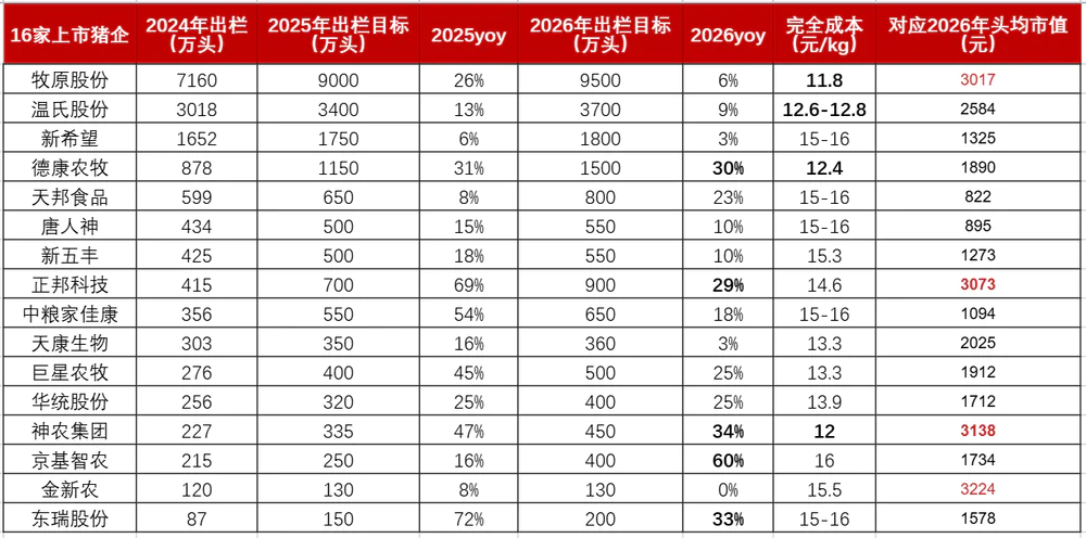 也就是說(shuō),當(dāng)下只能在不完美的組合中尋找相對(duì)最優(yōu)配置。我們粗略統(tǒng)計(jì)了16家上市豬企2026年的出欄目標(biāo)、對(duì)應(yīng)的出欄增速和頭均市值(生豬養(yǎng)殖板塊市值/2026年出欄目標(biāo))以及當(dāng)下的完全成本。投資者可通過(guò)表格數(shù)據(jù)進(jìn)行綜合判斷。