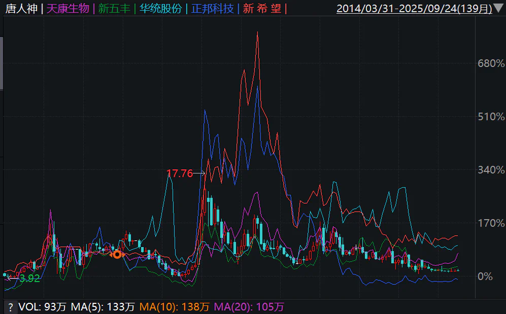2025年上半年,豬企的業(yè)績(jī)看起來(lái)頗為亮眼。牧原股份歸母凈利潤(rùn)達(dá)105.3億元,同比增長(zhǎng)1169.77%;溫氏股份歸母凈利潤(rùn)34.75億元,同比增長(zhǎng)159.12%;新希望歸母凈利潤(rùn)7.549億元,同比增長(zhǎng)162%;德康農(nóng)牧歸母凈利潤(rùn)12.92億元。然而,資本市場(chǎng)卻并不認(rèn)可。從月線來(lái)看,許多豬肉股仍在低位徘徊,部分甚至成了“僵尸股”,難以分享大盤上漲的紅利。