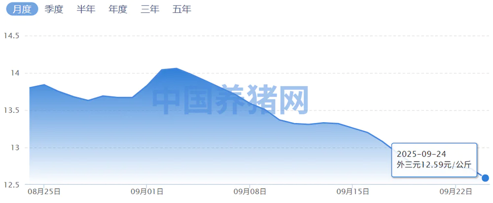 截至2025年9月中旬,國(guó)內(nèi)生豬外三元價(jià)格跌至約12.6元/公斤,自繁自養(yǎng)模式下行業(yè)平均成本約12.8元/公斤,現(xiàn)金成本在11 - 12元/kg,這意味著只有豬價(jià)跌至該區(qū)間,行業(yè)才會(huì)陷入現(xiàn)金流虧損,推動(dòng)產(chǎn)能被動(dòng)出清。