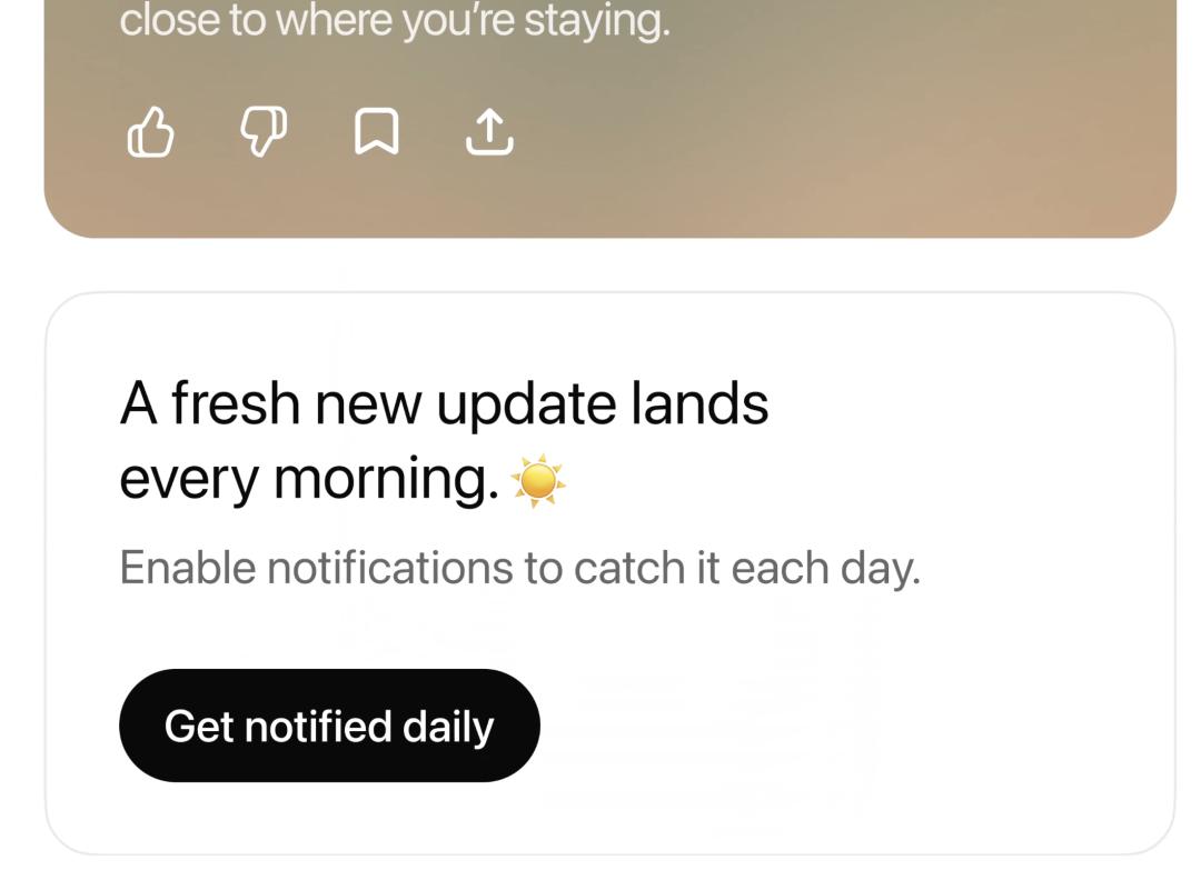 它甚至準備了一份“KAIYO屋頂餐廳晚餐攻略”,針對她無乳糖的習(xí)慣推薦了合適的菜品。Pulse還會主動詢問:“最近在想什么?我會記住并用于明天的更新”,并給出像“我對……很好奇”、“我接下來的計劃是……”、“我想持續(xù)跟進……”這樣的選項,邀請她分享想法以優(yōu)化未來的建議。