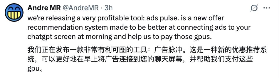 然而,網(wǎng)友對此卻不太認可,有人表示:這簡直是廣告推薦神器,能在早上把廣告更好地連接到聊天界面,為GPU來圈錢了。