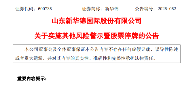 9月26日,新華錦發(fā)布公告,由于公司存在關(guān)聯(lián)方非經(jīng)營(yíng)性占用資金的情況,且未在1個(gè)月內(nèi)完成清償和整改,依據(jù)《上海證券交易所股票上市規(guī)則(2025年4月修訂)》相關(guān)規(guī)定,公司股票將被實(shí)施其他風(fēng)險(xiǎn)警示。