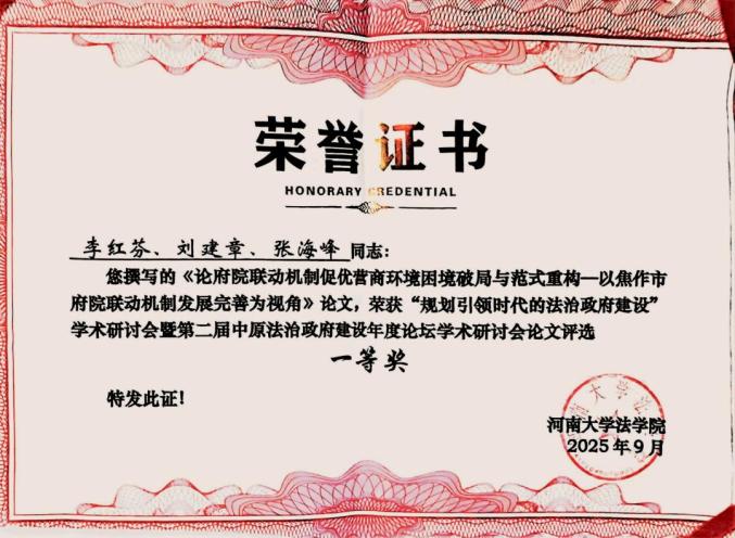 其中,由焦作中院李紅芬、劉建章以及解放區(qū)法院張海峰撰寫的《論府院聯(lián)動(dòng)機(jī)制促優(yōu)營(yíng)商環(huán)境困境破局與范式重構(gòu)—以焦作市府院聯(lián)動(dòng)機(jī)制發(fā)展完善為視角》榮獲一等獎(jiǎng)。