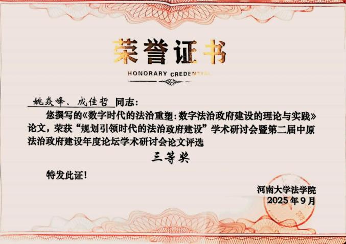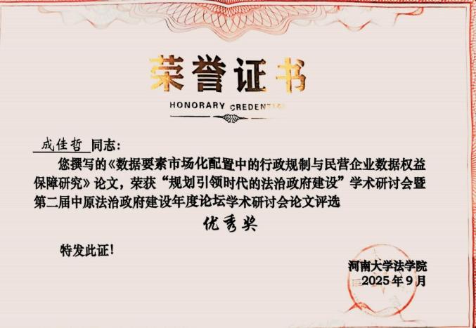 焦作中院成佳哲撰寫的《數(shù)字時(shí)代的法治重塑:數(shù)字法治政府建設(shè)的理論與實(shí)踐》和《數(shù)據(jù)要素市場(chǎng)化配置中的行政規(guī)制與民營(yíng)企業(yè)數(shù)據(jù)權(quán)益保障研究》,分別斬獲三等獎(jiǎng)和優(yōu)秀獎(jiǎng)。