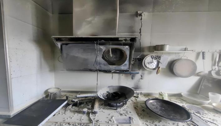 起火原因為戶主在廚房煮肉,未關(guān)火便去了客廳哄孩子,煮肉的鍋引燃抽油煙機