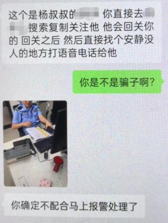 對方發(fā)來“警察叔叔”工作照片,并威脅“不配合就報警”。小舒嚇懵,添加了“楊叔叔”。