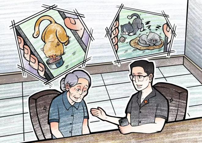 屏幕光照在徐阿婆布滿(mǎn)皺紋的臉上,她的眼神從回避、懷疑漸漸變成專(zhuān)注凝視。她開(kāi)始指著屏幕問(wèn):“這只小貓剛出生不久,給喂奶了嗎?”“這幾只平時(shí)很親近,你們可以把它們養(yǎng)在一起?!彼氖种赣袝r(shí)顫抖著,隔著屏幕輕輕撫摸熟悉的身影。那屏幕微光,如一縷暖陽(yáng),慢慢融化老人心中的堅(jiān)冰。