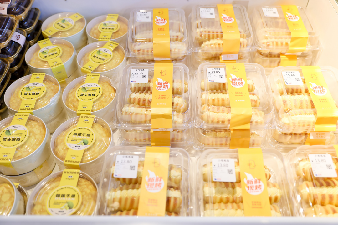 走進(jìn)店內(nèi),面包甜點(diǎn)和熟食的誘人香氣撲鼻而來。調(diào)改后大幅擴(kuò)增的現(xiàn)制熟食和烘焙區(qū)成了全場焦點(diǎn):核桃滿滿面包口感綿密,肉蛋堡餡料扎實(shí),榴蓮千層果香濃郁,眾多網(wǎng)紅單品吸引了不少年輕人駐足挑選。同時,物美注重“一城一策”的本地化調(diào)改與創(chuàng)新,和本土供應(yīng)商深度合作,店內(nèi)有不少杭州地道風(fēng)味美食,如醬鴨和鹽水鴨咸香可口,龍井茶酥茶香淡雅,臨安山核桃香脆濃郁,西湖藕粉口感溫潤,為杭州市民熟悉的味覺記憶帶來了全新體驗(yàn)。