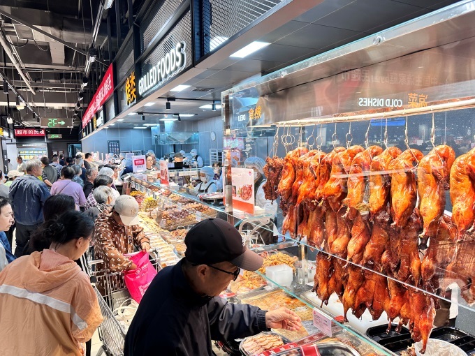 熟食區(qū)引入胖東來(lái)同款去骨豬蹄、小甜腸、牛肉干等網(wǎng)紅產(chǎn)品,同時(shí)保留北京烤鴨、韓式炸雞、土家鮮肉餅等經(jīng)典風(fēng)味,明檔廚房現(xiàn)場(chǎng)制作,保障食品新鮮與口感。