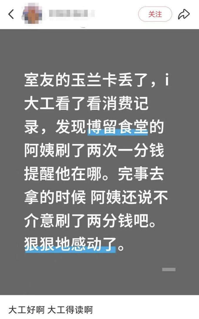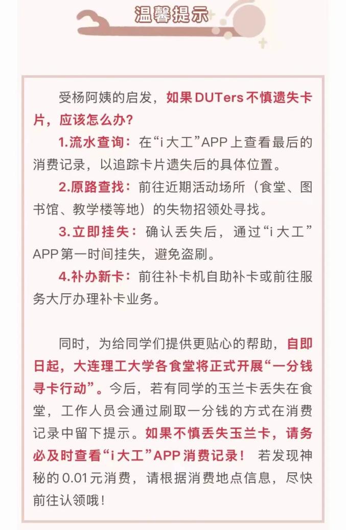 受楊阿姨啟發(fā),大連理工大學(xué)發(fā)文表示,自即日起,各食堂將正式開展“一分錢尋卡行動(dòng)”。以后若有同學(xué)的玉蘭卡丟在食堂,工作人員會(huì)通過刷一分錢在消費(fèi)記錄里留下提示。