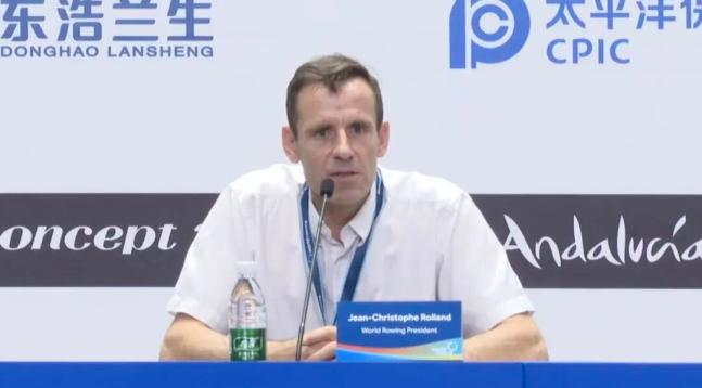 9月25日中午,世界賽艇聯(lián)合會主席讓·克里斯托夫·羅蘭和世界賽艇聯(lián)合會執(zhí)行主任文森特·蓋拉德在賽場新聞中心舉行了本屆世界賽艇錦標賽的首次新聞發(fā)布會,并當場回答記者提問。