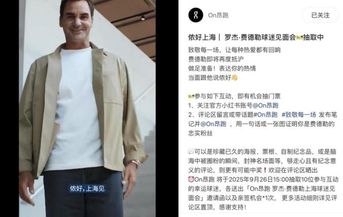 昂跑與費(fèi)德勒的合作是核心資產(chǎn)。2019年,費(fèi)德勒入股昂跑并代言,次年該品牌推出網(wǎng)球產(chǎn)品線。今年,“費(fèi)天王”效應(yīng)放大,昂跑上線上海限定網(wǎng)球系列,安排費(fèi)德勒球迷見面會門票抽獎,強(qiáng)化專業(yè)運(yùn)動和代言人偶像效應(yīng)。
