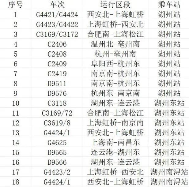 為滿足旅客出行需求,鐵路部門在啟用高峰線的基礎(chǔ)上增開旅客列車。其中,湖州站新增9列,湖州東站新增7列,湖州南潯站新增2列。增開列車信息如下: